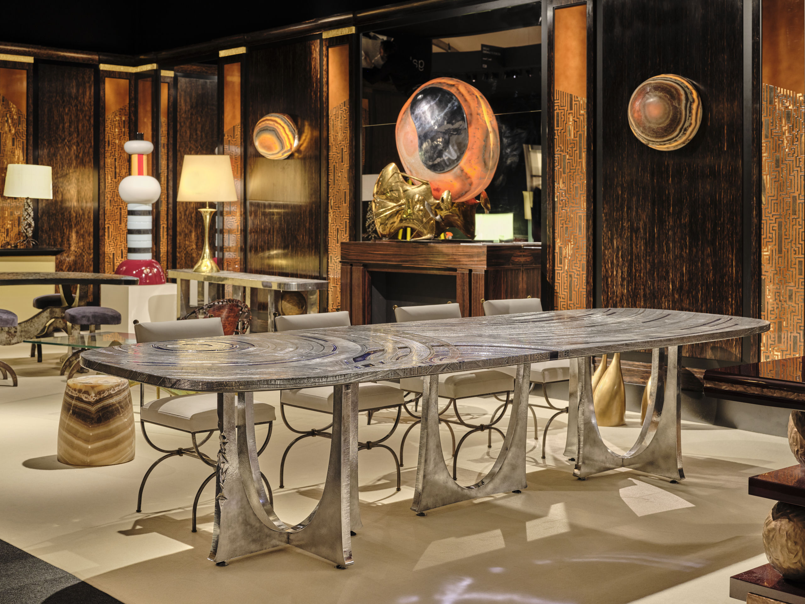 Jonckers will present his « Kozinga » dining table in aeronautical metal, nickel silver and resin, one of the boldest and most spectacular pieces of his creation. Every detail is conceived and chiselled with obsessive precision, creating a movement that seems to animate the table’s fixed surface endows the whole with a singular vibration. It is a unique, exceptional piece — the kind of work an artist creates only once in a lifetime.